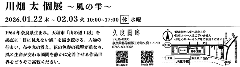 展覧会情報 2026 2026.01.20 川畑 太 個展 〜風の雫〜白日会関西支部支部長 日時 1月22日 (木) 〜 2月3日 (火) 水曜休 10:00〜17:00久度画廊〒636-0003 奈良県北葛城郡王寺町久度1-1-19℡ 0745-60-9076